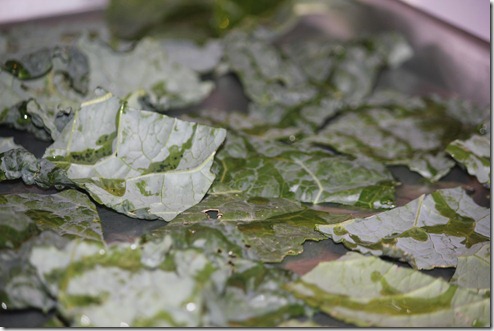 First, cut the Kale into bite sized pieces and spread on a cookie sheet: